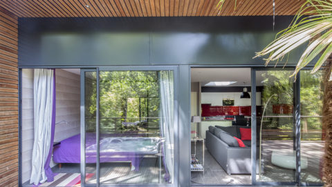Rouge des pinasses, vert des pins maritimes, bleu de l'Océan, cette symphonie des couleurs vous accompagnera dans ce gîte flambant neuf au cœur d'un bois magnifiquement arboré. Son bardage en pin Douglas, sa toiture plate végétalisée, cette demeure de villégiature illustre pleinement une démarche verte.